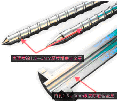 雙金屬螺桿又叫雙合金螺桿,是注塑機上專用的,是在普通螺桿表面電鍍一層合金,合金用于增強,提高耐腐蝕、耐磨損性能,適用于添加了玻纖、石粉等的塑料成型。