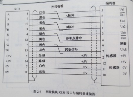 ??如圖2-4所示,SIEMENS 81OT/M系統也是通過測量模塊接收位置反饋信號的,一個測量模塊塊可以連接三個軸的位置反饋。測量模塊上面三個X111. X121和X131接口是連接位位置反饋的.圖2-6為測量模塊接口X131與編碼器的連接圖。另兩個接口X111和X121與X131是相同的。使用時要注意這三個接口的順序。
