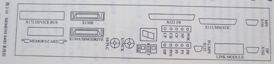 NCU控制板是系統(tǒng)的控制核心,系統(tǒng)CPU就在這個(gè)控制板上,除此之外,控制板上面還多接口、指示燈、按鈕和設(shè)定開關(guān),圖2-10為SIEMENS 840D系統(tǒng)控制板的正面示意圖。